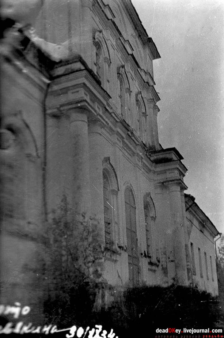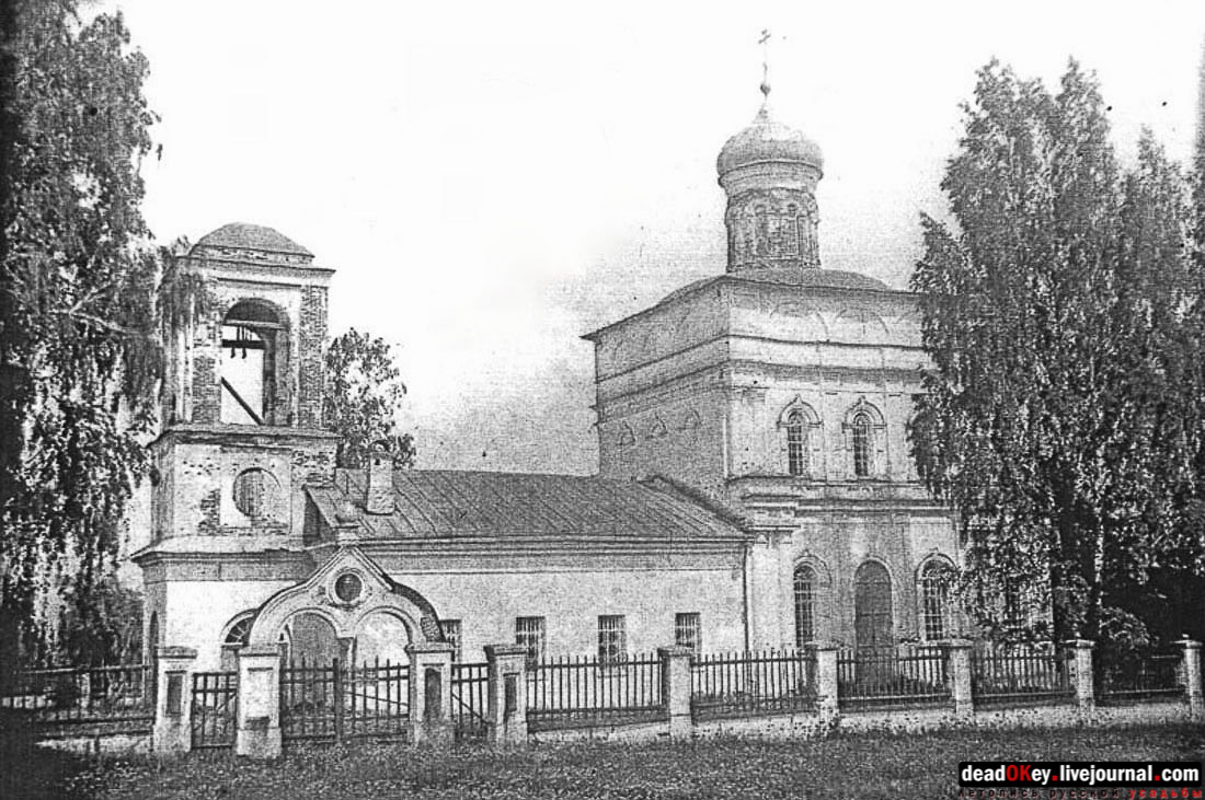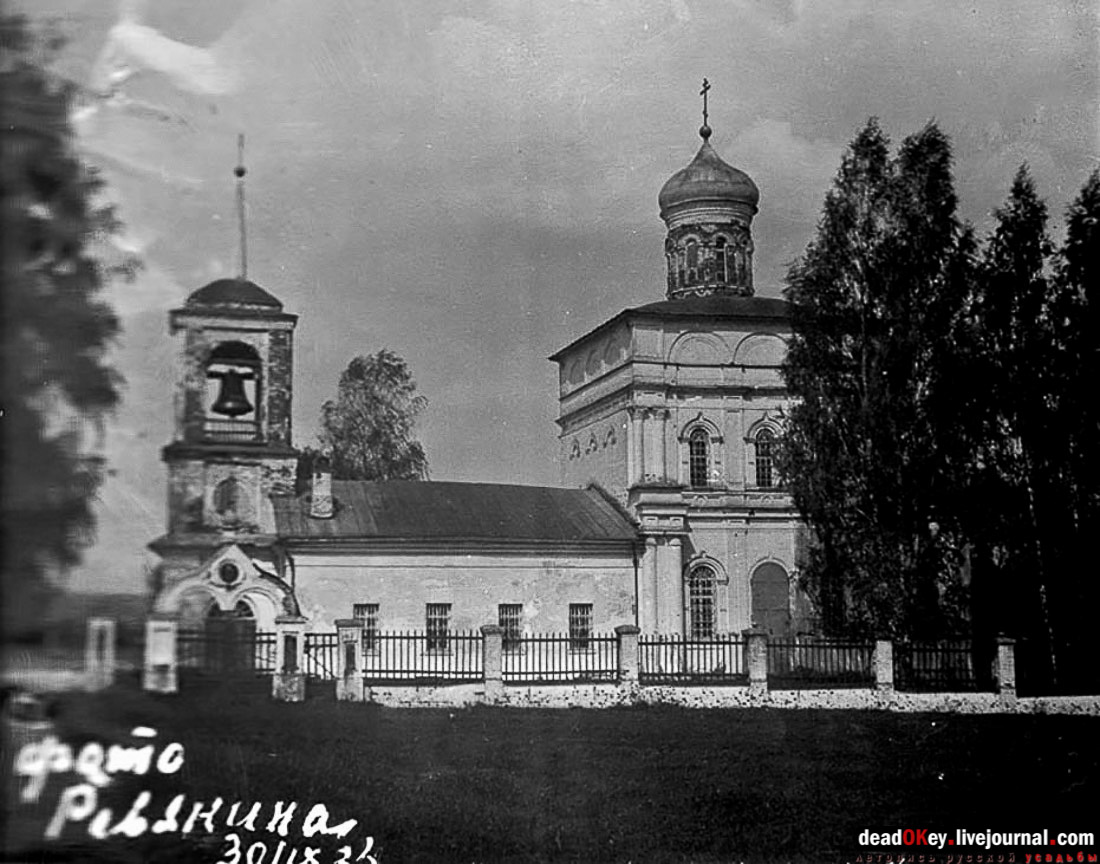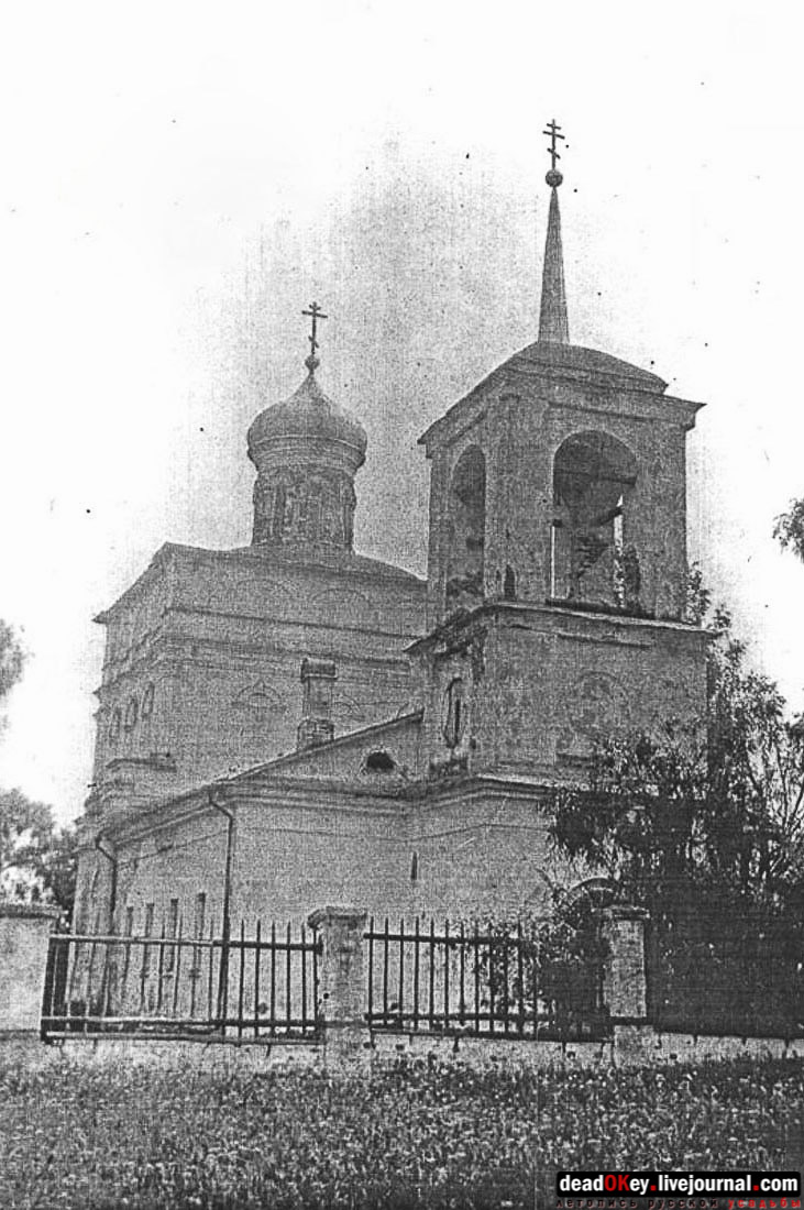 На фотографии 1935 года из дела ГАРФ. Ф. Р5263. Оп. 1. Д. 1263 церковь уже лишилась своей ухоженности. Сергей Мамаев пишет: "Из источника, пожелавшего остаться неизвестным, поступила следующая информация: 1. В храме был большой и высокий подвал. 2. Во время разорения храма трое неизвестных (один из них местный) срывали со стен иконы, разбивали оклады. 3. Тогда же с колокольни скидывали колокол, а местные жители стояли и смотрели на это бездейственно". |