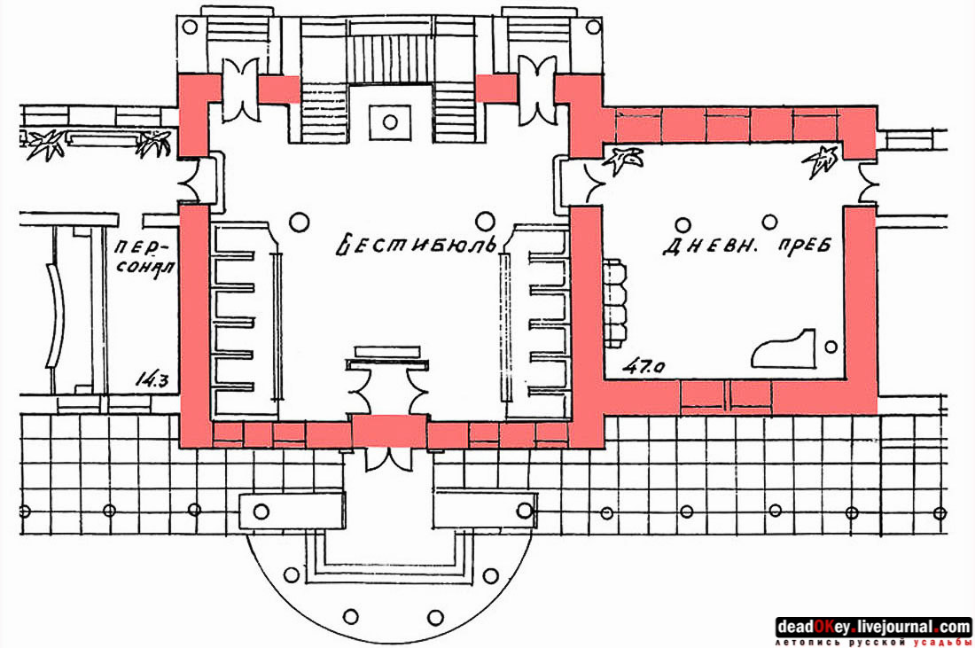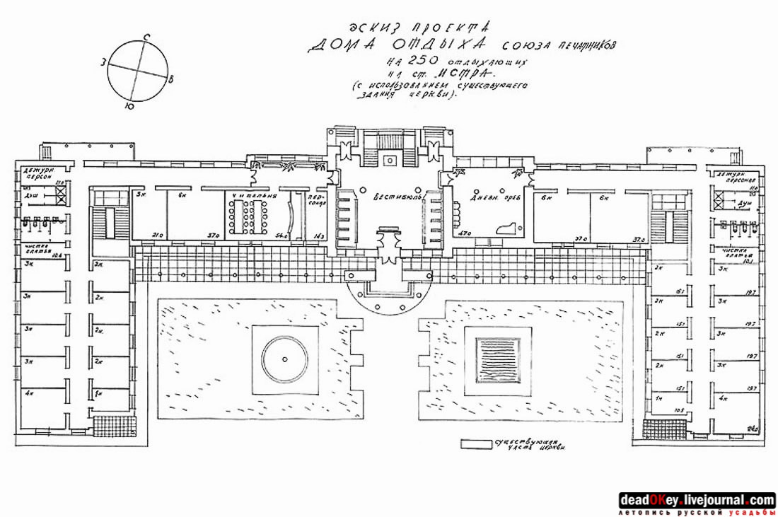 1934 год. Из дела ГАРФ. Ф. Р5263. Оп. 1. Д. 1263. Проект приспособления основного объёма храма в главном здании дома отдыха. |