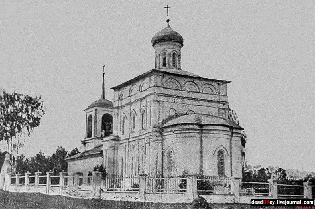 На сайте "Храмы России" приведена краткая справка о храме: "Кирпичный одноглавый храм в псевдорусском стиле, сооруженный в 1859 году при помощи купца П. Г. Цурикова, близкий к образцовым проектам. Трапезная с Покровским и Сергиевским приделами и колокольня в стиле классицизма остались от прежнего здания 1813-1820 годов. Был закрыт в 1934 году, сломан в 1938 году". |