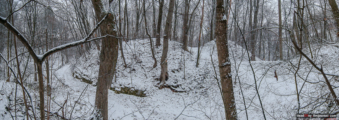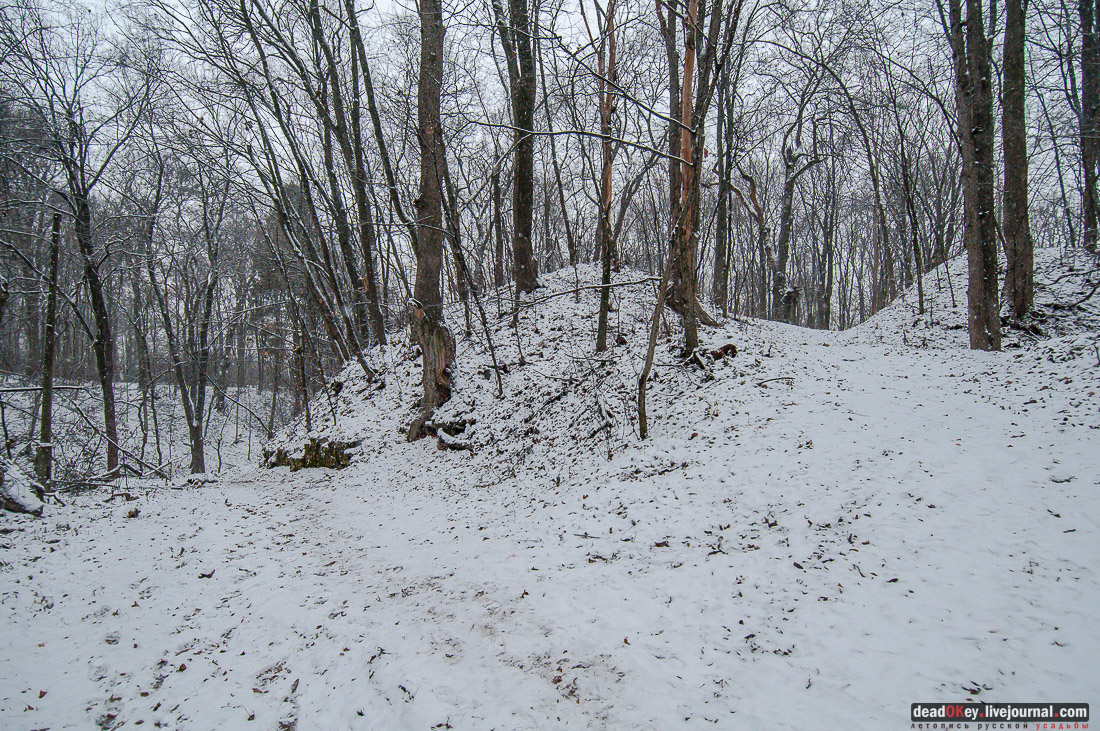 44. По оврагу течет ручей, при выходе в пойму Истры он пересекает дорогу, на этом пересечении из-под городища бьёт родник. |