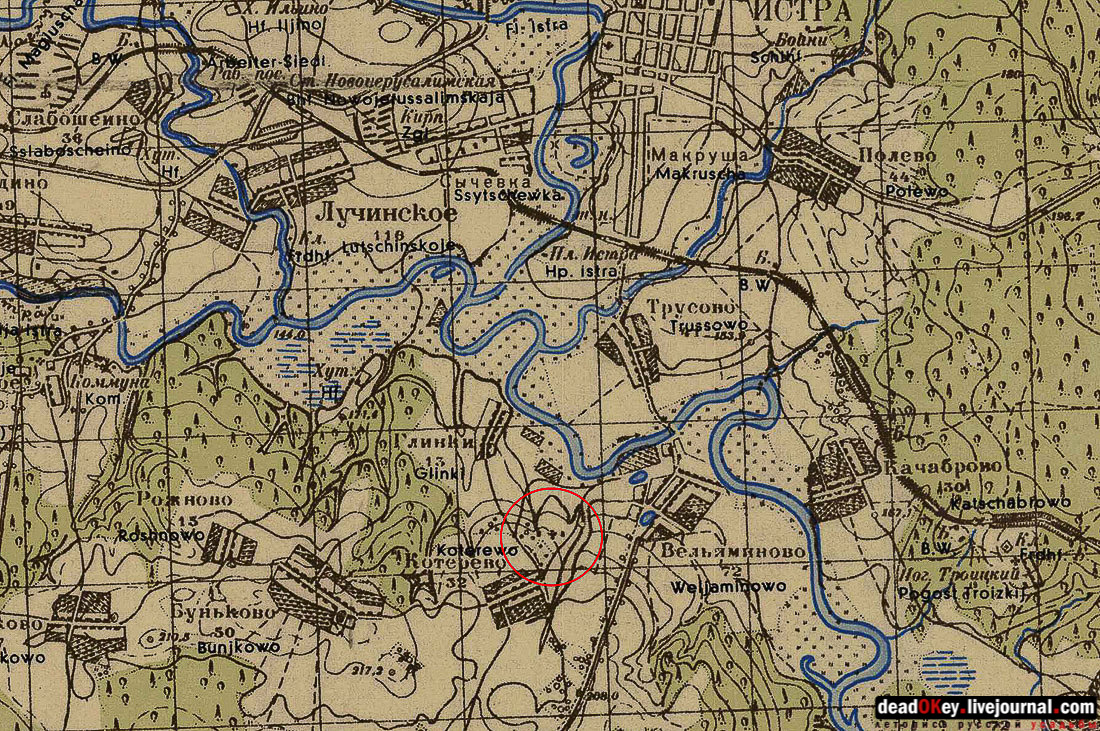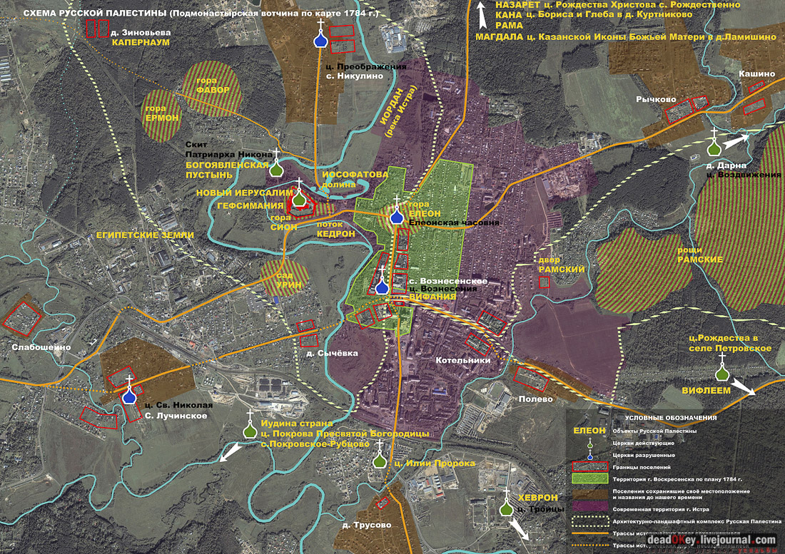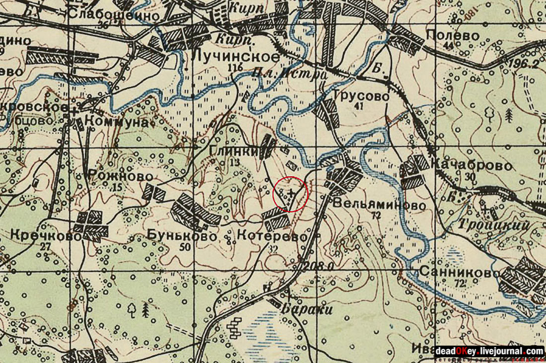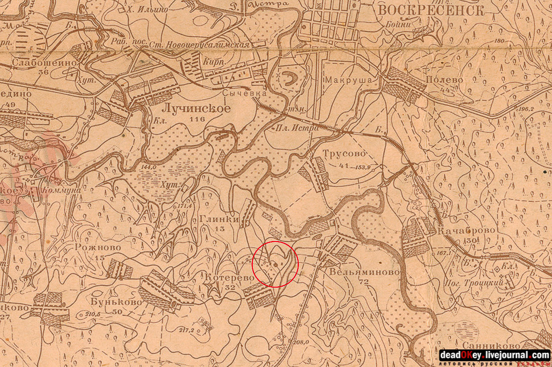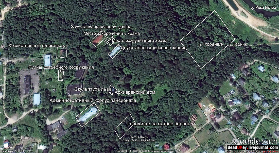 В заключении нашей публикации схема расположения объектов Ильинского Погоста, составленная Константином Косенковым, и краеведческая справка Сергея Мамаева: "Погост Ильинский, или село Ильинское на Городище (ныне не существует), находилось в 2 км южнее Истры, на крутом правом берегу реки Истры. Издавна на погосте стоял храм святого пророка Илии, а к северу от него располагается древнее городище – полукруглая площадка размером 64 х 34 метра. Городище было впервые раскопано в 1924 году. К тому времени оно все было занято кладбищем. Погост иногда называли село Ильинское-Городище. Перед началом войны на его месте начали строить дом отдыха газеты «Правда». Уничтоженный в годы советской власти каменный храм в честь Илии Пророка построили в 1813 году". |