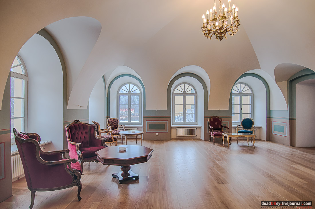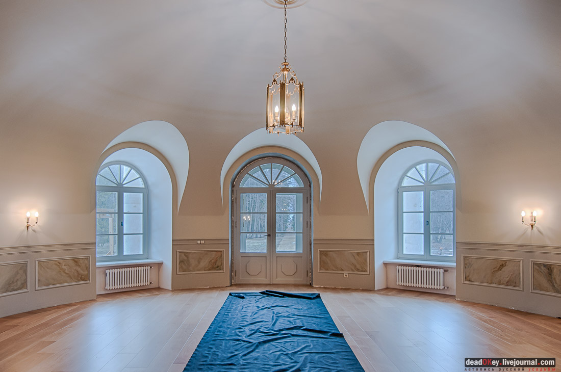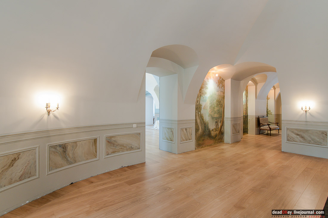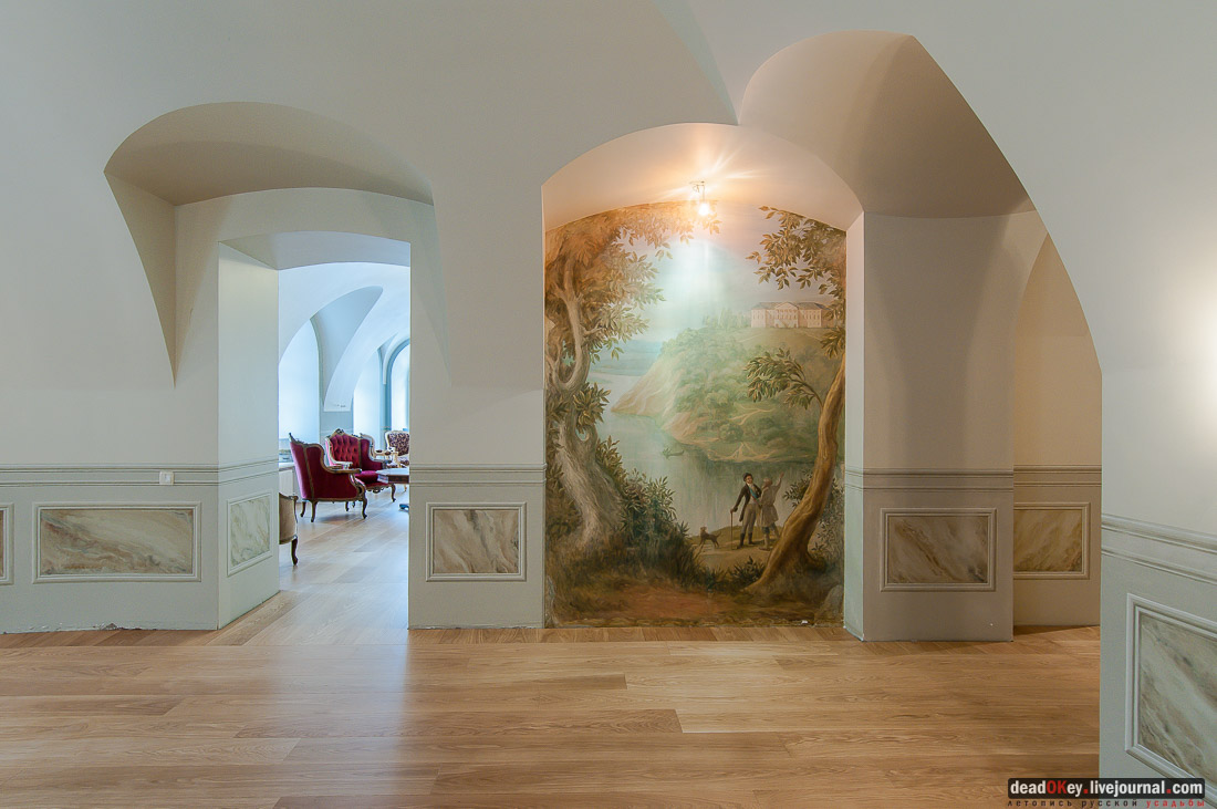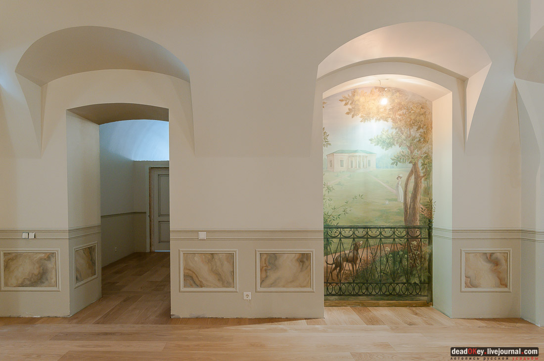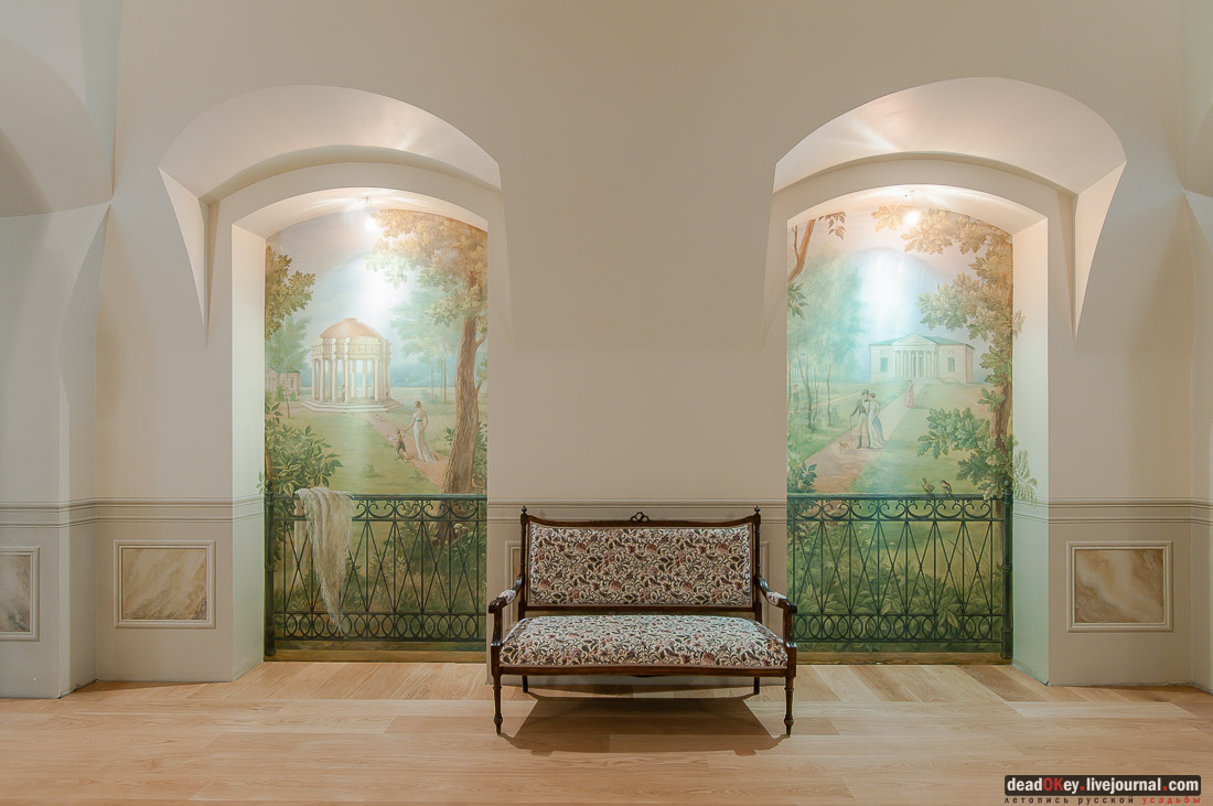 38. В описаниях Греча, кн. Нарышкиной и Голицыной сохранились описания вестибюля. Основное, что там было - картины Причетникова по стенам и пилонам аркад. Именно на картинах и решили сделать основной упор, а не искать абстрактные аналоги сводчатых вестибюлей в Павловске или иных усадьбах.. |