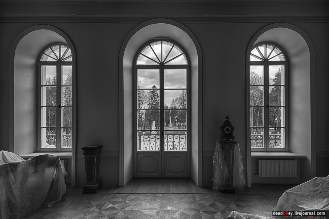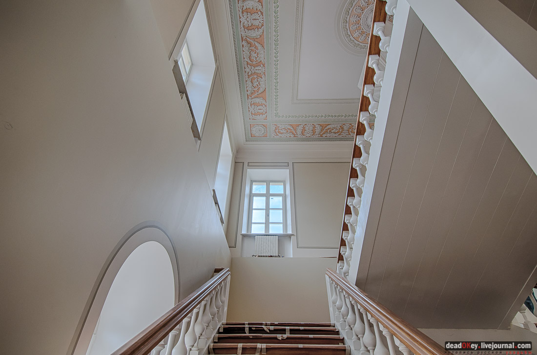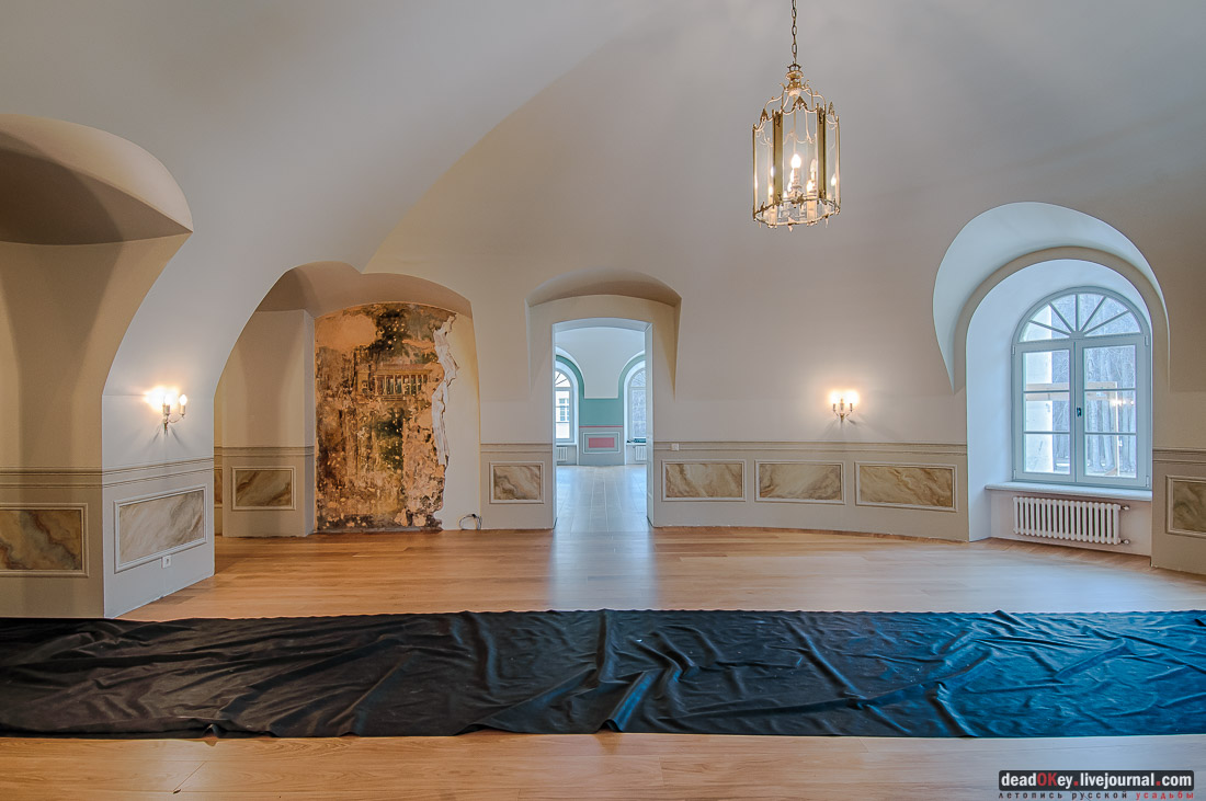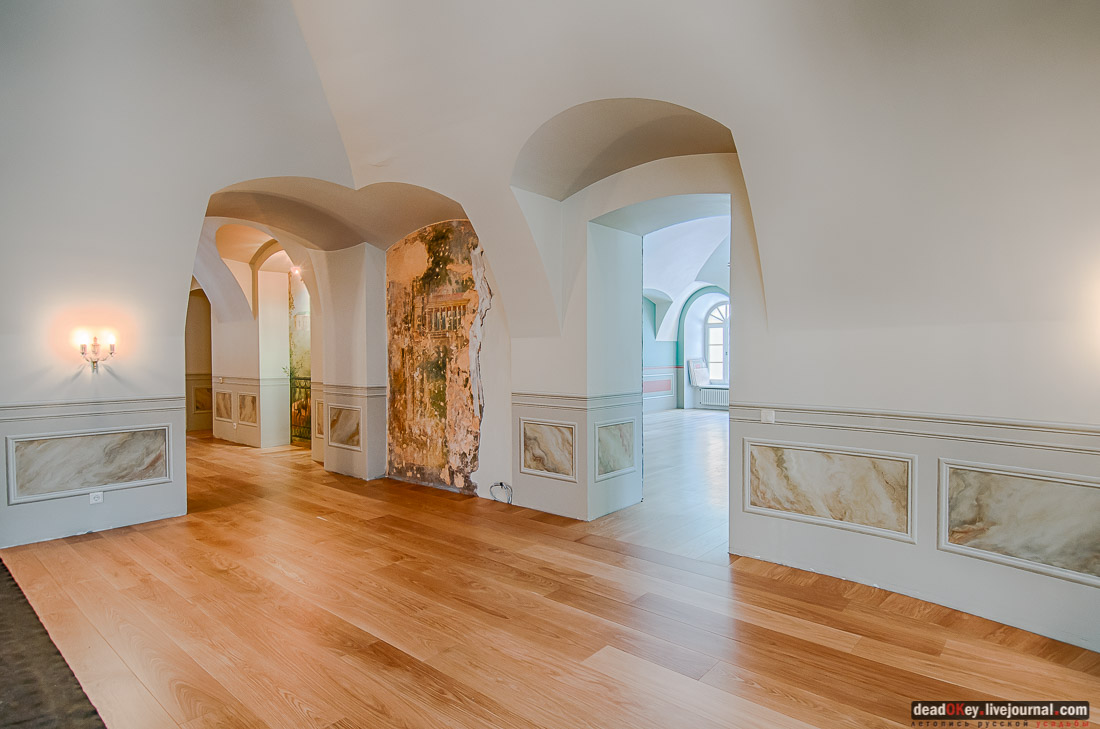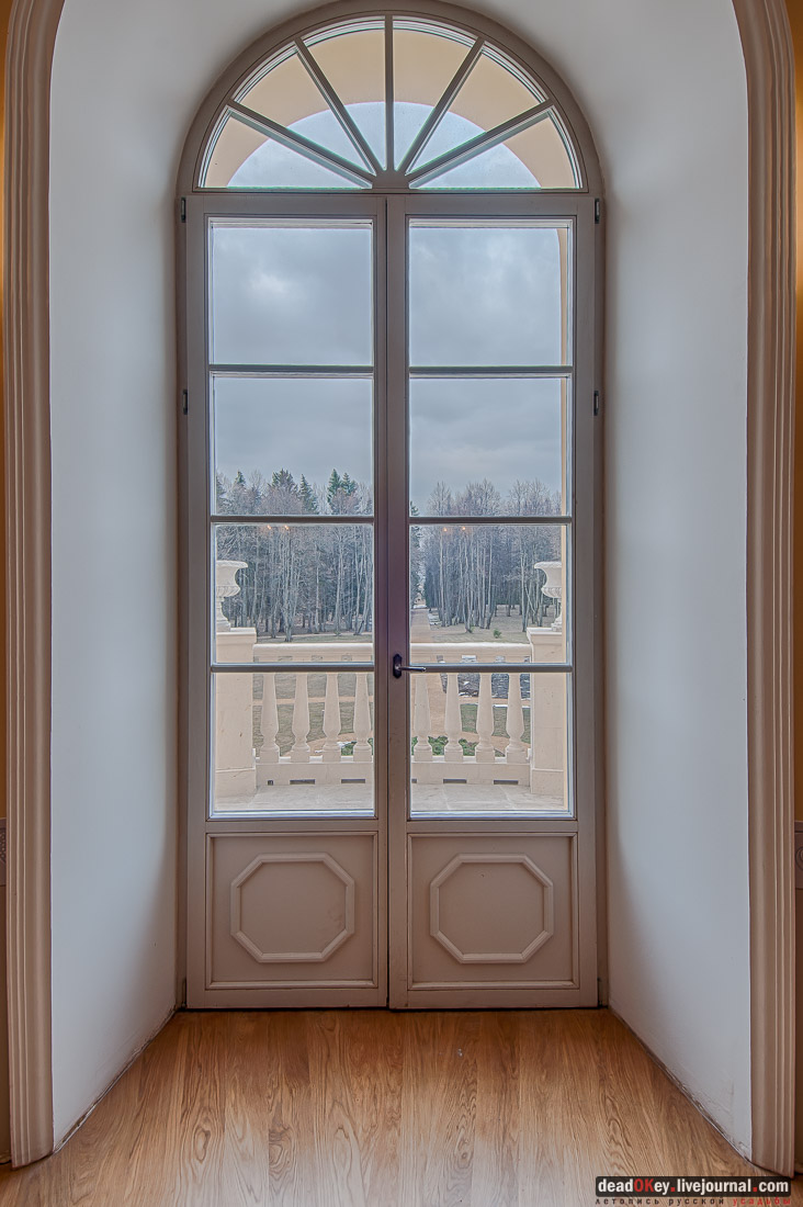 54. Оконные рамы все деревянные, а не пластиковые. Они воспроизводят детали родных рам. Копии делали по сохранившимся. Единственно, не стали делать рамы двойными, каковыми они были тогда. Во-первых 85 двойных деревянных оконных рам это - не дешево, да и не практично сейчас в использовании, когда можно использовать стеклопакет. Но сам обрис рам и все внешние детали реально воспроизведены. |