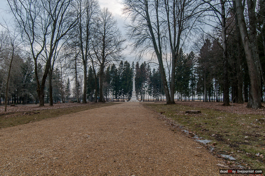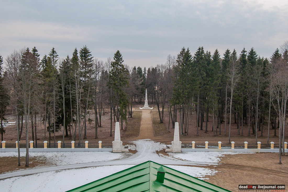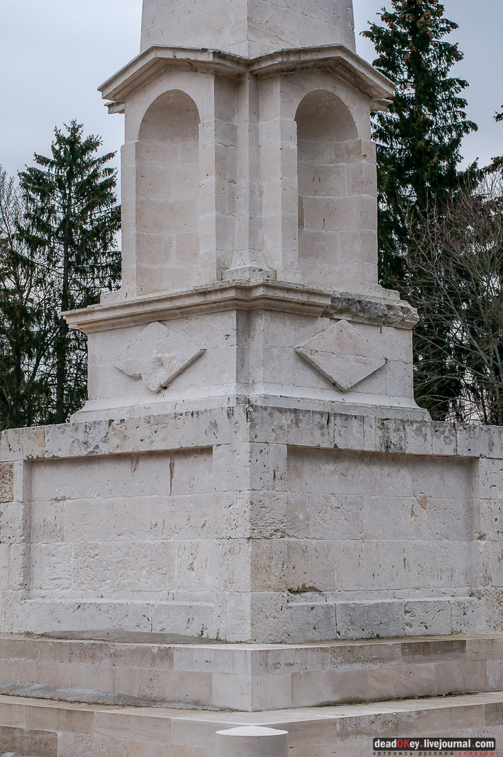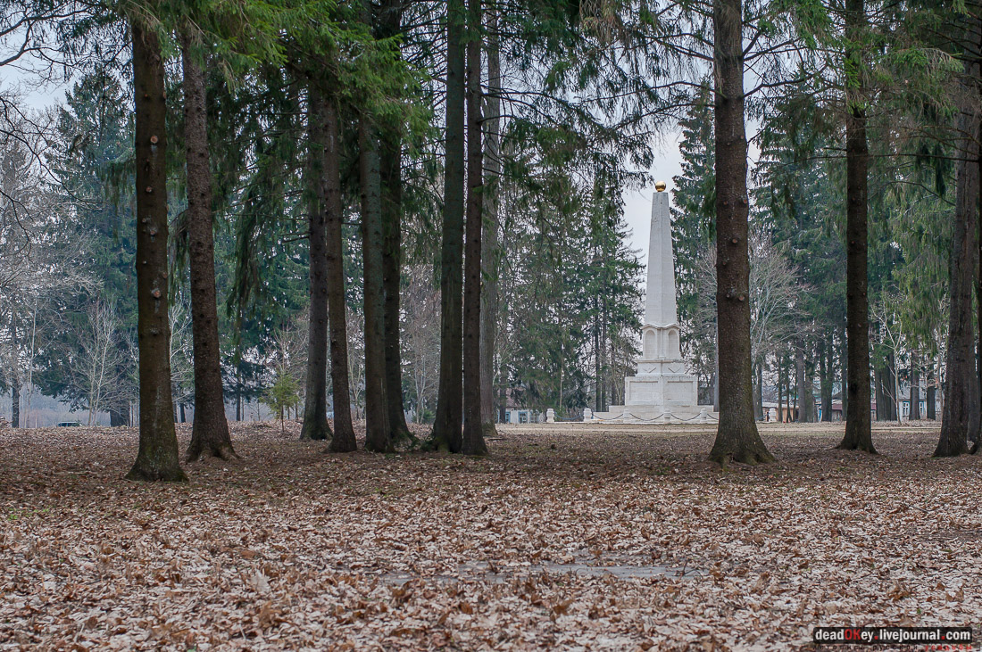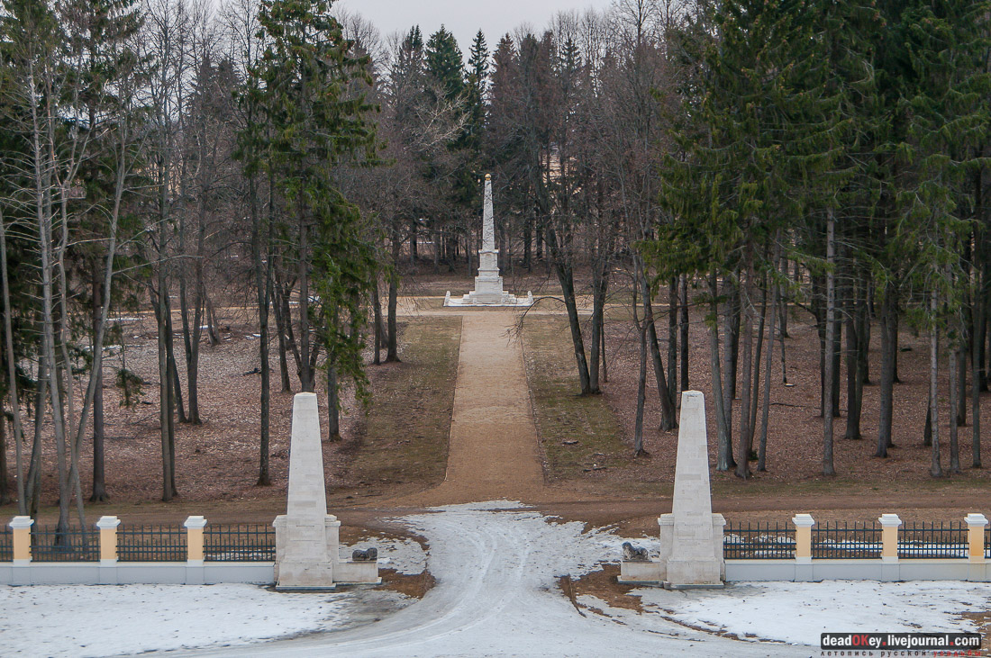 6. А.Н. Греч в "Венке усадьбам" писал в 1920-е годы: "через дорогу, по другую сторону усадьбы, в конце прямой дорожки, ориентированной по центральной оси планировки, остался стоять обелиск старицкого камня. На ступенчатом цоколе возвышается постамент с глубокими нишами, служащий основанием стройной четырехгранной игле, увенчанной шаром. Вокруг стоят еще покосившиеся белокаменные тумбы, вероятно, соединявшиеся некогда цепями друг с другом. Обелиск лишен надписей, но, как позволяют установить архивные документы, он был поставлен князем Александром в память умершего брата Степана как трогательный знак дружеской привязанности в силу тех же вкусов пресыщенных людей конца XVIII века, находивших в сентиментализме на лоне идиллической природы отдохновение своей усталости и утонченности. Такой же монумент с характерной стихотворной надписью был сооружен и в Надеждине". |