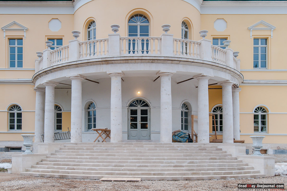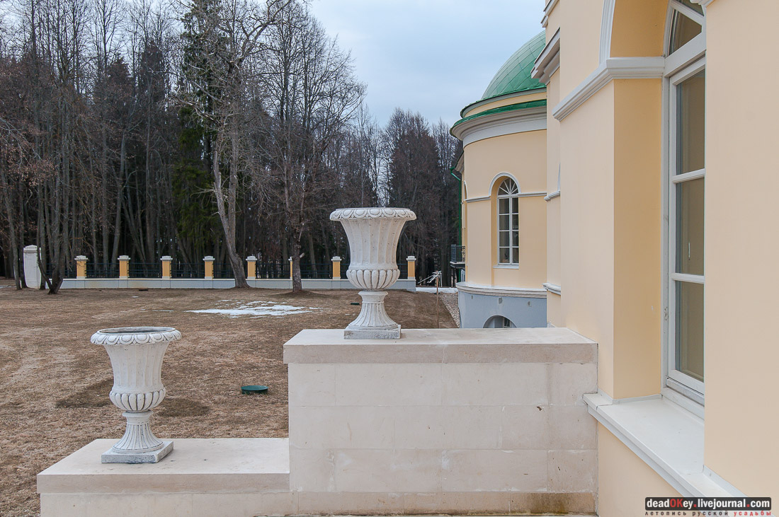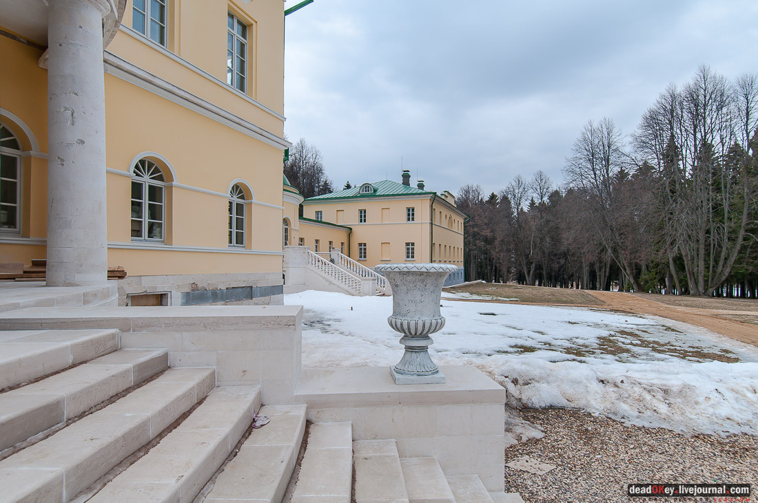 9. Со слов Сергея Васильева: "Совсем недавно нашел изображение каменных львов, которые должны лежать у парадных въездных стелл. Когда я купил усадьбу, их уже не было, но местные жители рассказывали, что в советское время они здесь еще стояли. Пациенты психбольницы перетаскивали их с места на место, но сохранили. А в 1990-х львы куда-то пропали. Недавно под Звенигородом мы нашли человека, который увез их и еще кое-что из усадьбы, чтобы сохранить от мародеров после пожара. И в результате наши львы нашлись в парке другой усадьбы, куда их разместили на сохранение». Усадьба эта принадлежит семье покойного бизнесмена Бориса Федорова, который первым из российских предпринимателей приобрел для восстановления заброшенную усадьбу. Списался с семьей Федорова, переговорил с ними, и теперь львы, потрепанные жизнью, вернулись в родную усадьбу." |