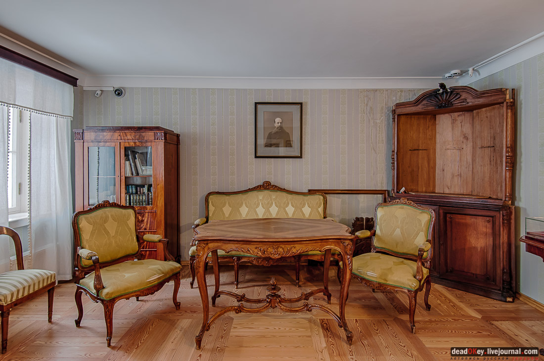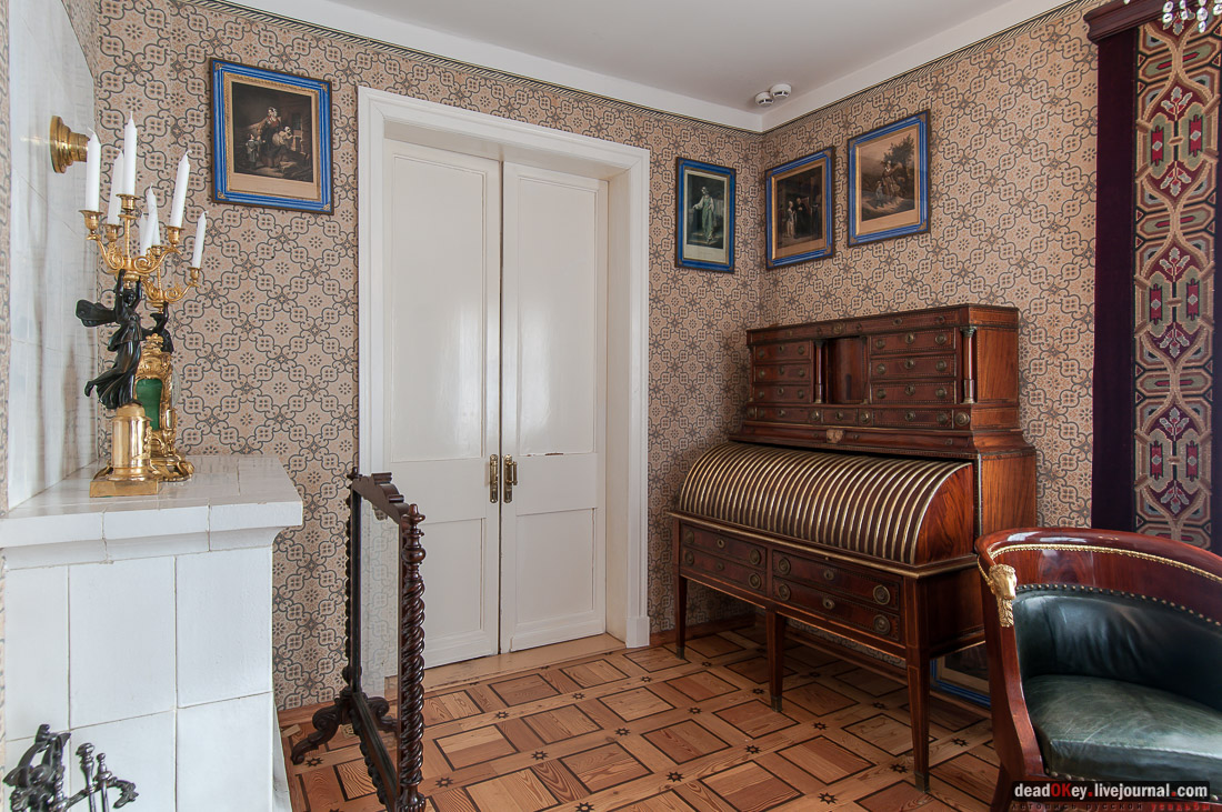 3. Кабинет Н.И. Тютчева, реконструированный по фотографии 1915 года. Ее интерьер составляет в основном ампирная мебель русской работы. В Мураново мебель в основном привезли из имения Е.Ф. Тютчевой Варварино Владимирской губернии. Варварино на карте усадеб Владимирской области здесь. |