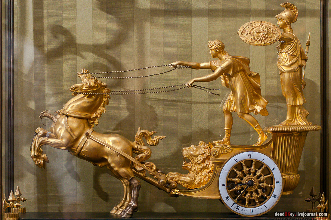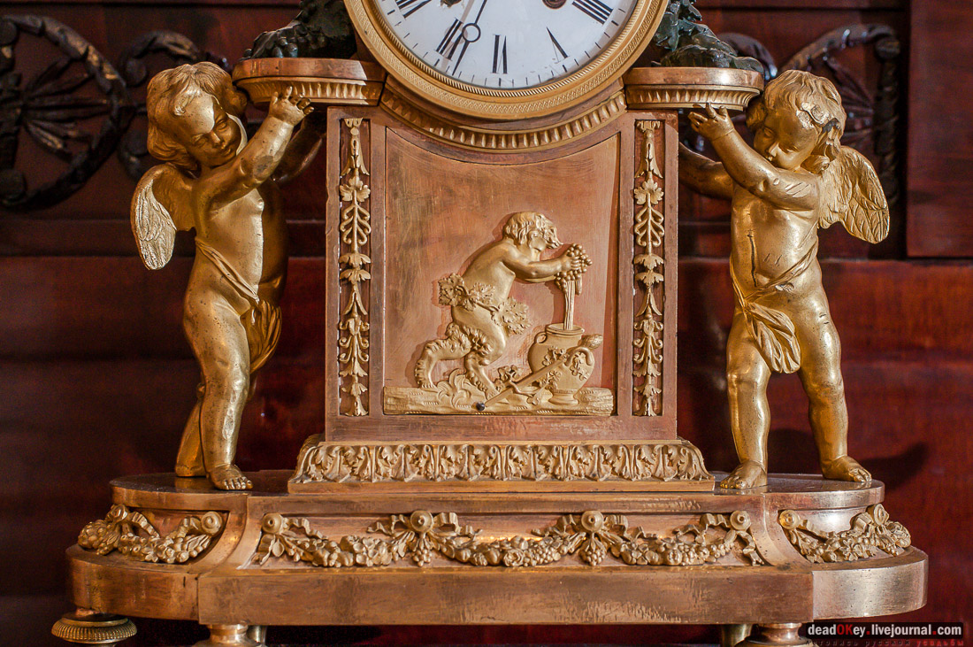 27. Голубая гостиная. Эта небольшая комната, подобно Зеленой гостиной, получила свое название по цвету обоев и обивки мебели. Примечательностью ее интерьера является большое зеркало в богатой раме красного дерева, украшенной декором из чеканной бронзы (Франция, 1830-е гг.). Почти на столетие ранее изготовлено круглое зеркало в резном золоченом обрамлении стиля «рокайль» (1740–1750- гг.). |
