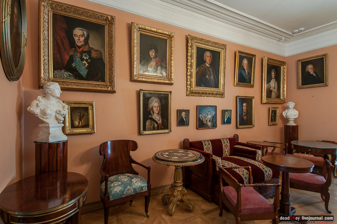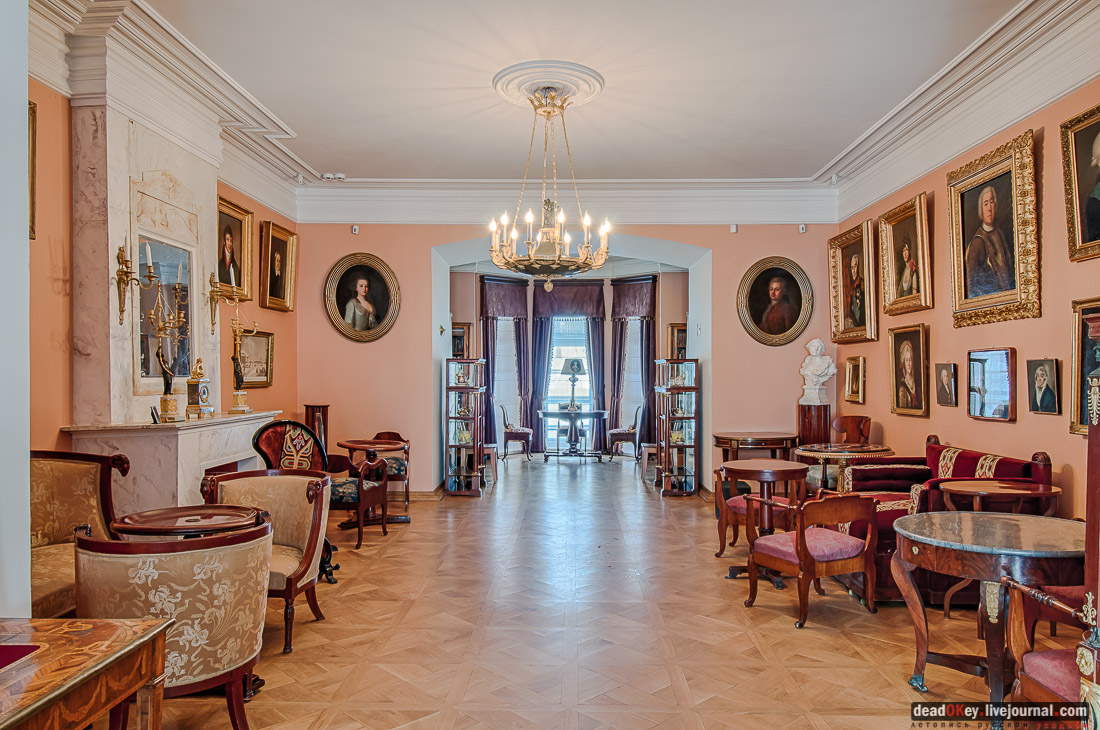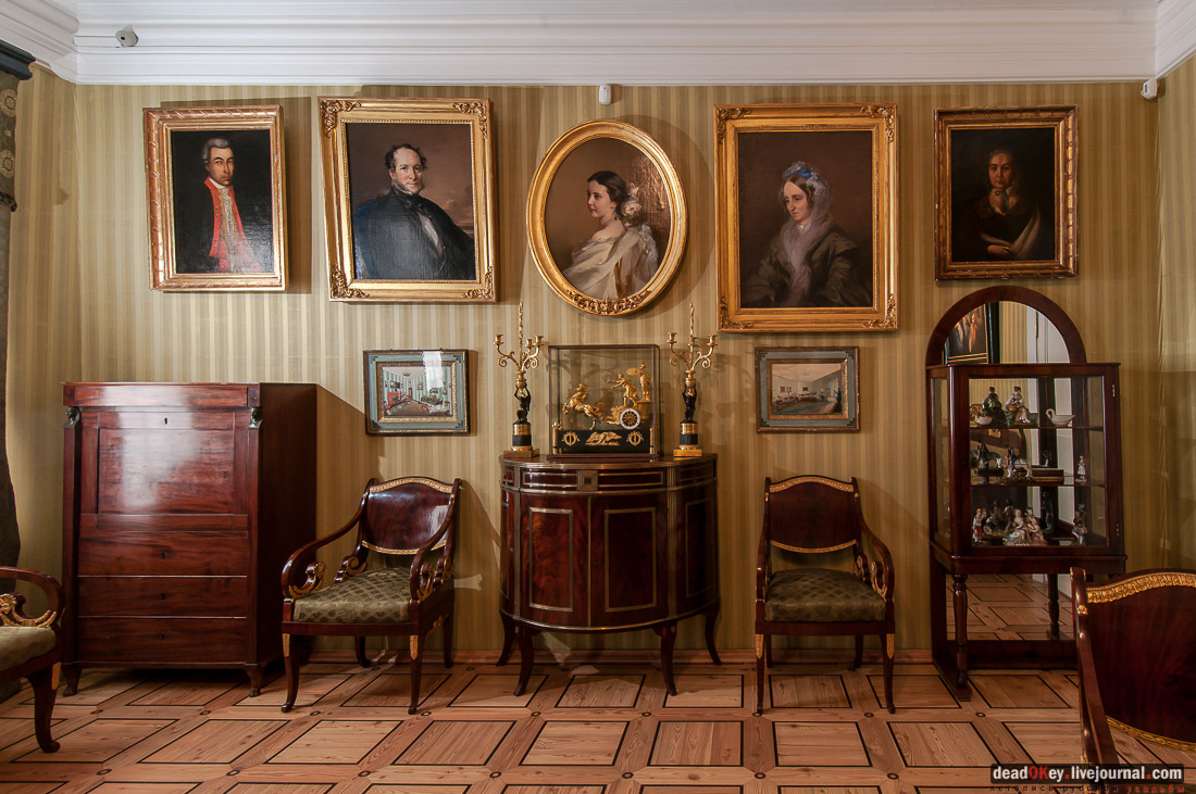 18. Украшением гостиной является большая бронзовая люстра со скульптурной группой мифологического содержания, а также французские канделябры и часы, украшающие камин. Интересны и такие экспонаты, как ломберный столик наборного дерева конца XVIII в. и удобные кресла-"корытца" устойчивой формы, созданные в России в начале XIX века. Привлекают внимание круглый стол, декорированный итальянской мозаикой и массивный диван – «крапо» (1840-е гг.). Прекрасны изделия из фарфора известных русских и зарубежных производств XVII-XIX веков. Активную роль в создании художественного облика Большой Гостиной играет семейная портретная галерея. |