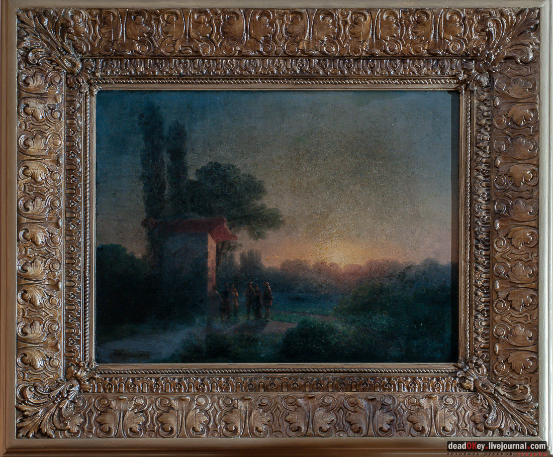 4. Пейзаж "Закат". Написан в 1871 году Иваном Константиновичем Айвазовским, принадлежал Николаю Ивановичу Тютчеву (внуку поэта), был приобретен для его художественной коллекции. Известный маринист Айвазовский изредка обращался к "сухопутной" тематике, поэтому пейзаж представляет собой редкость в корпусе произведений художника. |