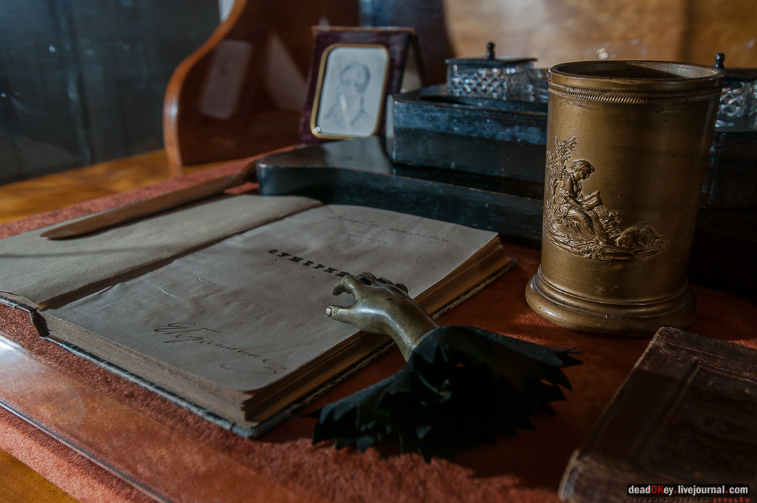 21. В 1873 году, после смерти Фёдора Ивановича Тютчева, его сын Иван Фёдорович перевёз в Мураново библиотеку, архив и личные вещи поэта. Был сюда перевезён и его письменный стол – массивный, двухтумбовый, со столешницей, крытой тёмно-зелёным коленкором. На столе – сделанный из латуни многопредметный письменный прибор: подставка для чернильниц и перьев, стаканчики для карандашей и ружейной дроби, которой чистили гусиные перья, спичечница, колокольчик. |