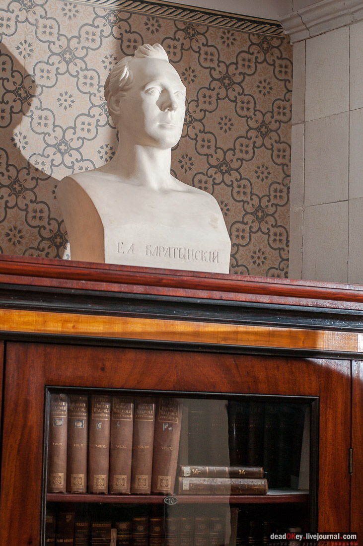 В 1842 году Боратынский разобрал старый дом Энгельгардтов и по собственным чертежам и планам построил новый дом для своей семьи. Дом весь деревянный, но парадные комнаты имеют высокие потолки, дверные и оконные проёмы, соответственно, она нуждается в большей теплозащите и поэтому эта часть дома обложена кирпичом. В нём до сегодняшнего дня сохранилась обстановка рабочего кабинета поэта Евгения Абрамовича Боратынского. В этом кабинете он готовил к изданию свою последнюю поэтическую книгу «Сумерки», вышедшую в свет в 1842 году. |