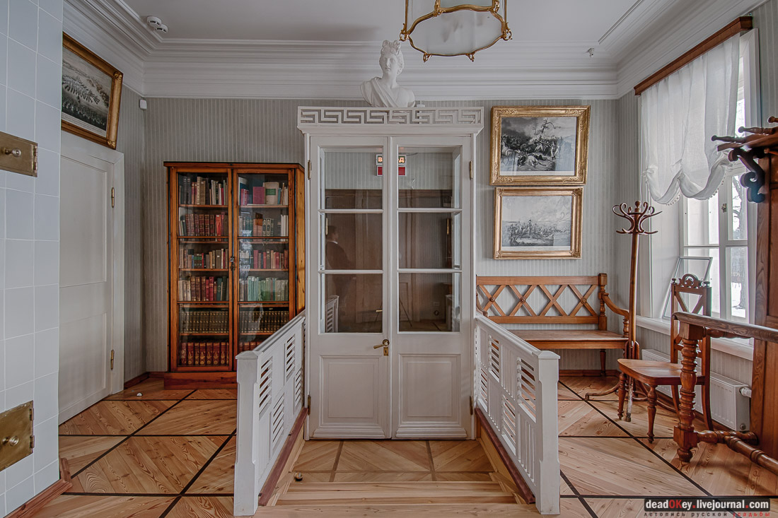29. Прихожая открывает анфиладу парадных комнат по южному фасаду. Простая по форме мебель, изготовленная из дуба и ели во второй половине прошлого века, создает ощущение уюта и изысканной простоты. Комнату украшают старинные гравюры и литографии. Они воспроизводят героическое прошлое России, во многом определившее национальное самосознание того поколения молодых людей, к которому относились Е.А. Боратынский и Ф.И. Тютчев. Интересно аллегорическое изображение Петра I на гравюре известного изографа А. Зубова, а также раскрашенные гравюры начала XVIII века, исполненные с оригиналов П.Д. Мартена. |