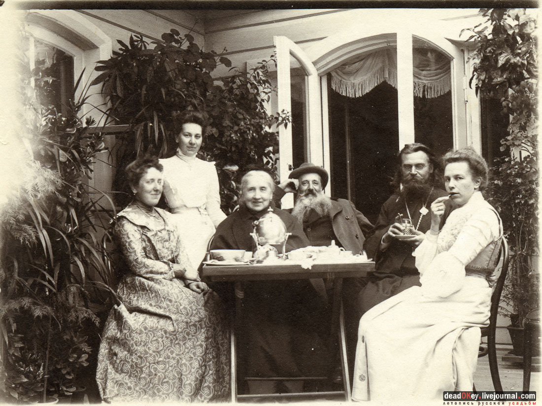 1902 год. Чаепитие в зимнем саду. Слева направо: Софья, Екатерина, Ольга Николаевна и Иван Федорович Тютчевы, священник Иоанн Добросердов, Ольга Дмитриевна Дефабр (урожденная Тютчева). Автор: Федор Иванович Тютчев. |