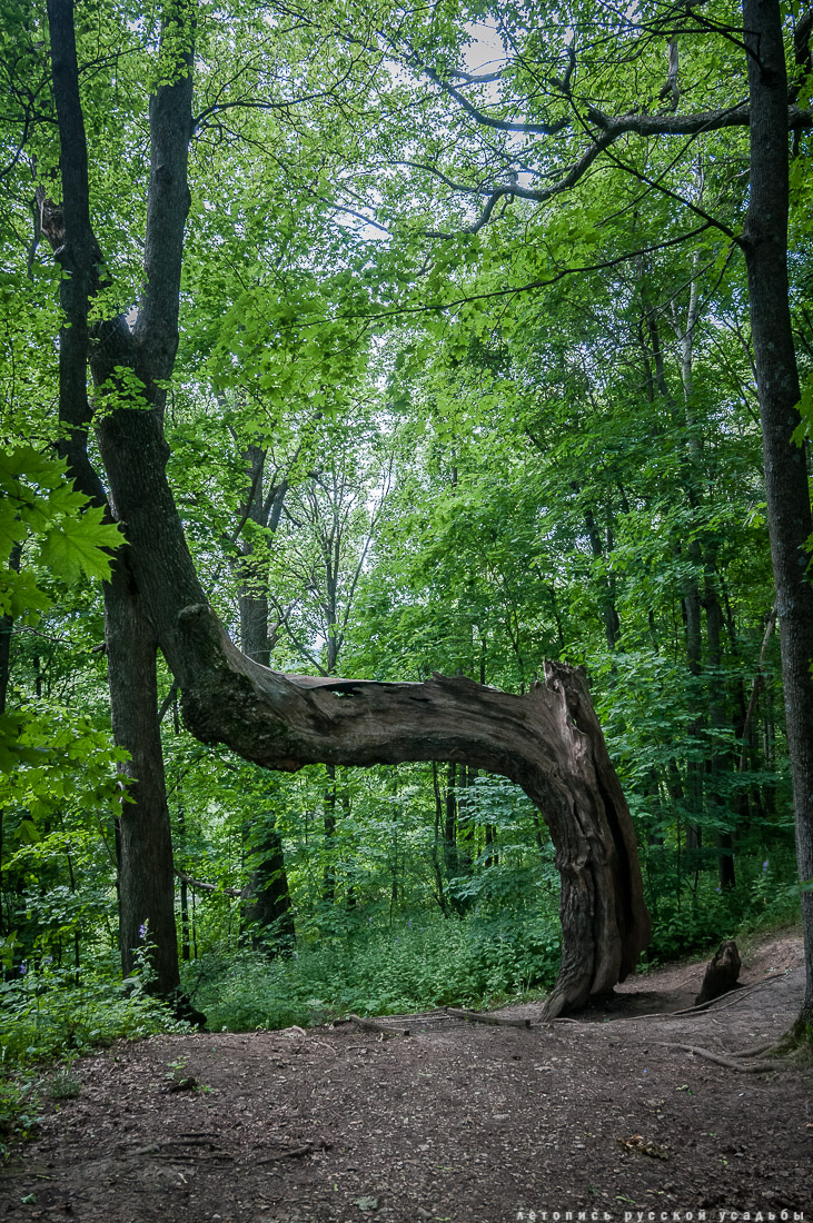 43. Знаменитый дворяниновский дуб-арка. Он был расколот молнией, но выжил и сросся с соседним деревом, образуя причудливый арочный проем. Болотов называл этот дуб символом победы жизни над смертью. Существует поверье, что, пройдя через эту "арку", можно обрести крепкое здоровье и долголетие. |