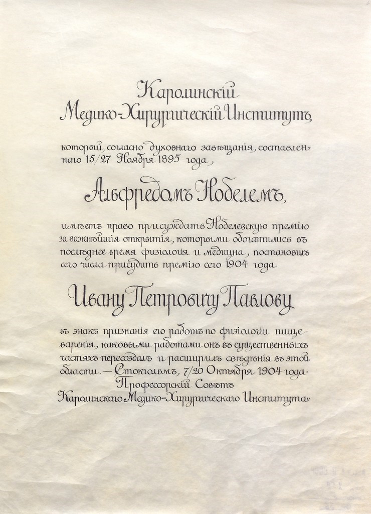 1904 г. Диплом лауреата Нобелевской премии, выданный И.П. Павлову Каролинским медико-хирургическим институтом в 1904 г. Подлинник на русском языке. 7 (20) октября |