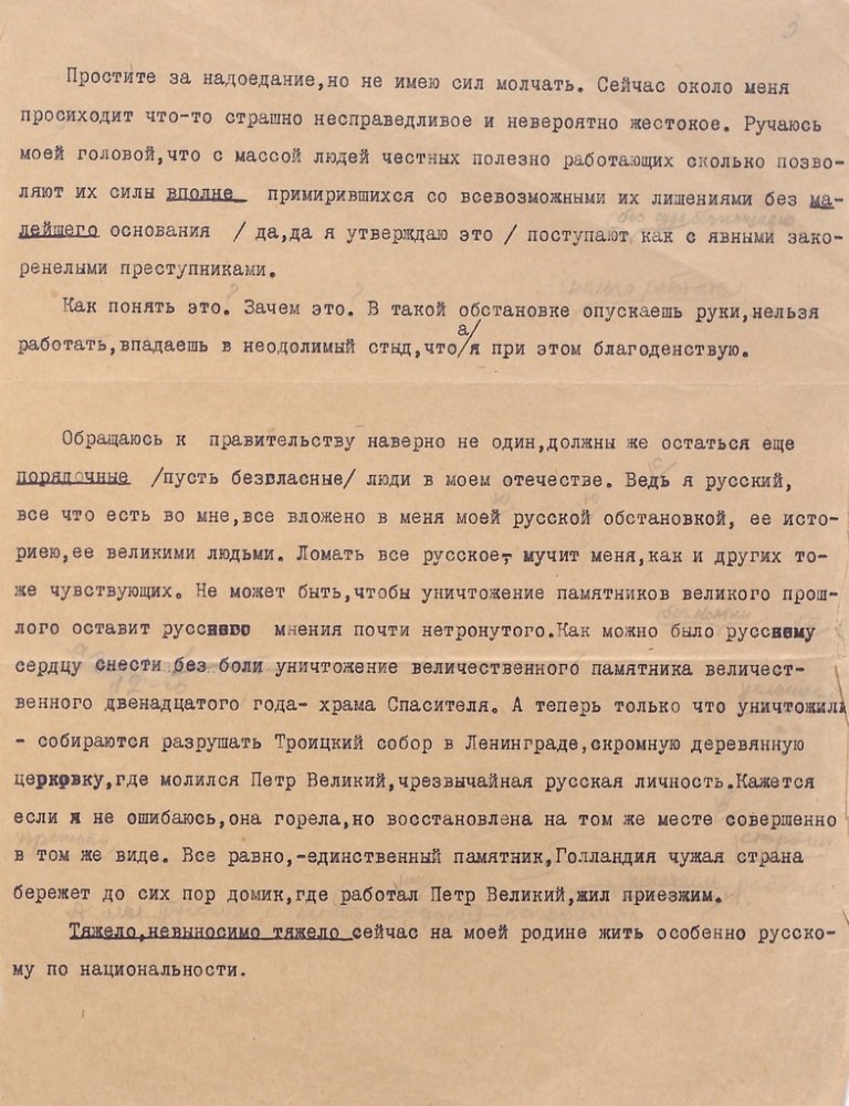 1931 г. Письмо И.П. Павлова в СНК СССР с выражением протеста против уничтожения Троицкого собора в Ленинграде, в котором молился Петр I. 5 декабря |