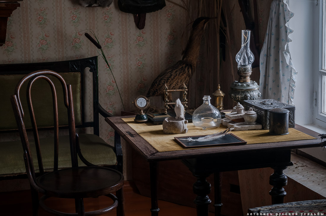 17. Комната Ивана Павлова. Чернильница "Гнездо птички" (на столе справа) вырезана из дерева детьми П. Д. Павлова. |