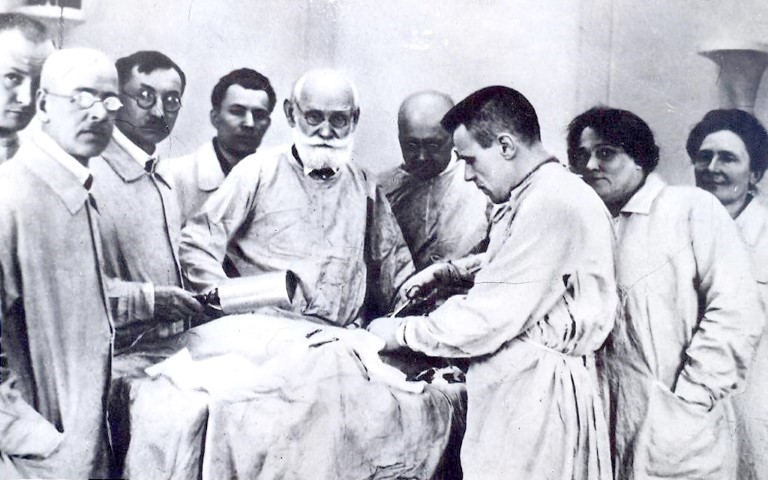 1936 г. Академик И.П. Павлов с группой сотрудников Института экспериментальной медицины во время операции. |