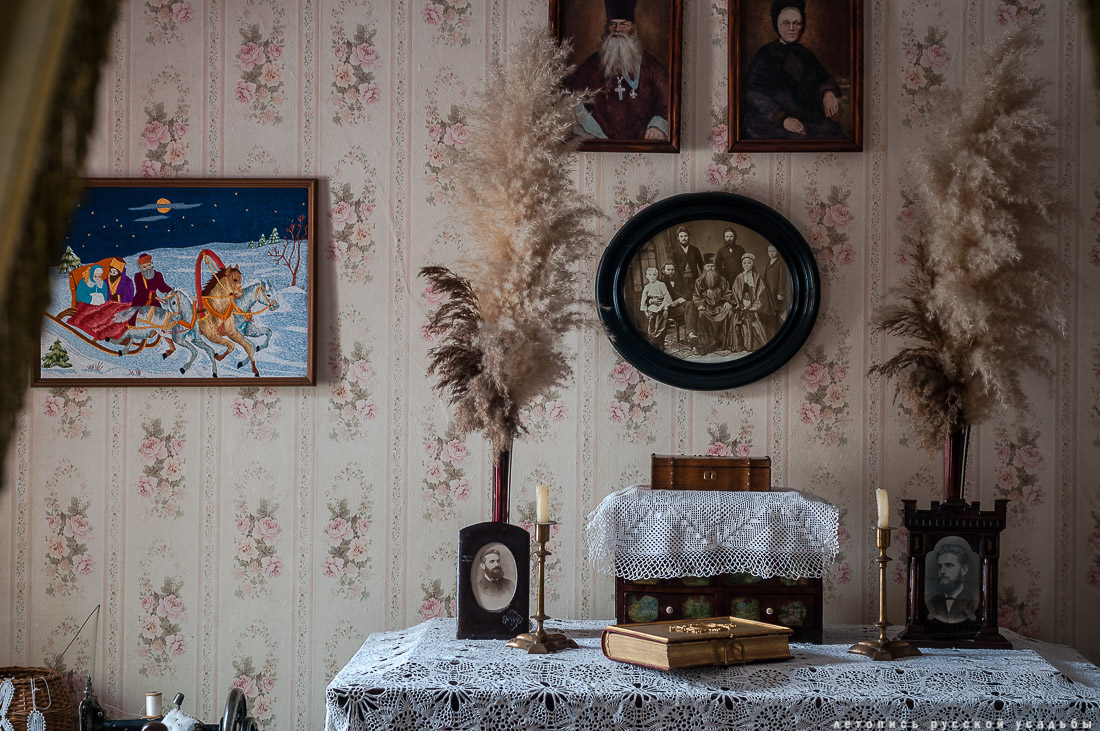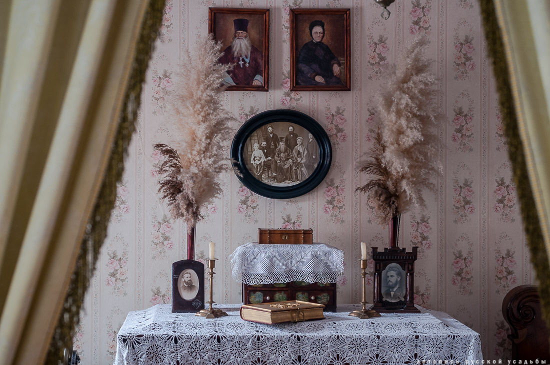 21. Комната Варвары Ивановны. На стене висит портрет самой матушки и ее супруга. Ниже - семейный фотопортрет. |