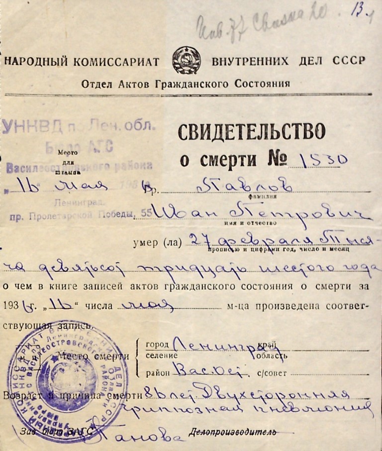 1950 г. 27 февраля. «Свидетельство о смерти И.П. Павлова». На официальном бланке Отдела актов гражданского состояния Народного комиссариата внутренних дел СССР. |