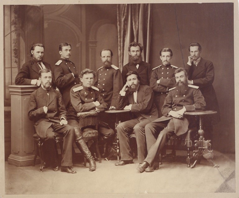 5. И.П. Павлов (третий справа в верхнем ряду) и группа врачей и преподавателей Медико-хирургической академии. 1878–1879 гг. |