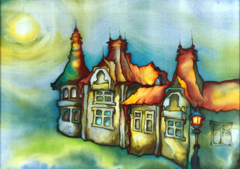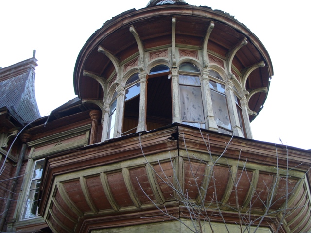 Красочность архитектуры дополняли мансардные балкончики, выступающие из объёмов кровель, и наполовину скрытые в тени деревянного узорочья. |