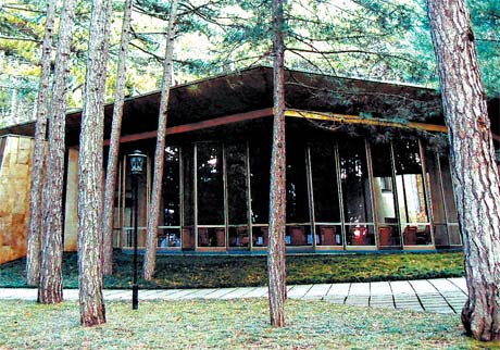 Тогда из Москвы с мебельной спецфабрики «Люкс» двумя железнодорожными вагонами доставили в Крым сборную конструкцию из деревянного бруса. Одноэтажный дом собрали без единого гвоздя точно на указанном месте. Он сохранился в целости и сохранности до сих пор. Разве что в 1969 году его один раз покрывали олифой. Внутри располагались вестибюль, кабинет, столовая и санузел, в котором специально для Сталина установили низкую ванную. Снаружи дом смотрелся обычным срубом, а внутри каждая комната выглядела, как шкатулка: стены и потолок отделали панелями из десятка пород ценных деревьев. Но Сталин жить там не стал и с 1949 года на массандровской госдаче, да и в Ялте, не появлялся. Уже по распоряжению Брежнева в 1973г. рядом построили большой павильон из стекла и металлоконструкций — зал для переговоров. Находится за Массандровским дворцом. |